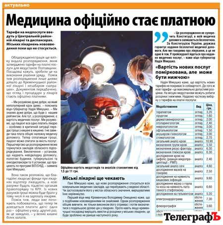 Матеріал минулого номера «Кременчуцького Телеграфу» «Медицина офіційно стає платною», в якому розповідалося, що облдержадміністрація видала розпорядження, яким затверджено тарифи на платні послуги для медустанов Полтавщини, викликав чималий резонанс як серед пацієнтів, так і серед лікарів. Перші здивовані, чому за медпослуги доведеться платити, якщо згідно Конституції –медицина є безкоштовною, другі пояснюють чого саме торкнеться нововведення.