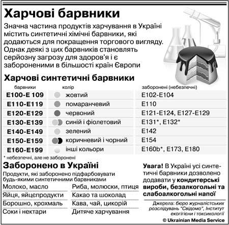 Такого перечня в Украине не создано. Мы запросили данные в Укрметртестстандарте – подразделении Госпотребстандарта, государственного органа, уполномоченного защищать права потребителей. И изучили результаты исследований Центра независимых потребительских экспертиз «Тест» – общественной организации, регулярно проводящей такие экспертизы. Из их данных следовало, что красители, использование которых ограничивают в Европе, содержатся в 12 наименованиях продуктов.