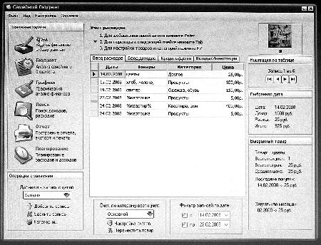 Выбираем в пункте «Учет» пункт «Доходы». Указываем, что 25 февраля получили 1000 гривень зарплаты. Затем заходим в «Расходы» (квартплата, продукты питания, траты на проезд, одежду, развлечения и другое) и описываем, куда потратили на рынке 100 гривень. Много времени на это не понадобилось: большинство товаров уже «забито» в программу, мы их просто выбираем из списка. Категория товара тоже выводится автоматически (молоко – продукты, свитер – вещи). Постепенно заполняем расходы за неделю. Компьютер автоматически отображает, сколько денег у нас остается по итогам каждого дня. С помощью программы можно также вычислить, на что ваша семья тратит больше всего денег. Например, на какой продукт за неделю ушло максимальное количество средств. Кроме того, можно сравнивать, по какой цене вы покупали один и тот же товар – ведь всех мелочей в голове не удержишь, а данные, «забитые» в компьютер, всегда под рукой. Вычислить самую большую статью трат в вашем бюджете можете