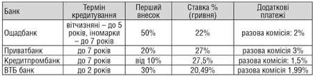 «Кредитпромбанк» дає гроші тільки на будівництво нового житла. Вам запропонують квартиру у певному будинку, у зведення якого банк вкладає кошти. Умови такі: 27% річних, перший внесок – 25% від вартості житла плюс одноразова комісія (1%+ 500 грн). Двокімнатна квартира у новобудові коштує від 335 тис грн, таким чином, кредит дадуть, якщо ви одразу готові викласти понад 85 тис грн.