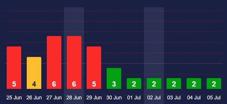 У п’ятницю, 28 червня, К-індекс (показник, який характеризує геомагнітну активність і класифікує геомагнітні бурі) сягне 6 балів. У суботу показник дещо знизиться — показник геомагнітної активності становитиме 5 балів.