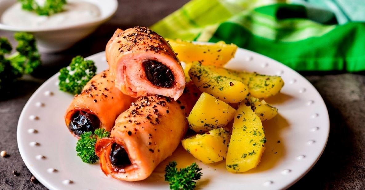 - Після цього викладіть по краях філе чорнослив і скрутіть у рулет.