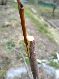 В розріз. Держак щепи повинен мати меншу товщину, ніж підщепа. Прищеплювану гілку, заточену в формі клина, вставляють в бічний розріз, поєднуючи тканини.