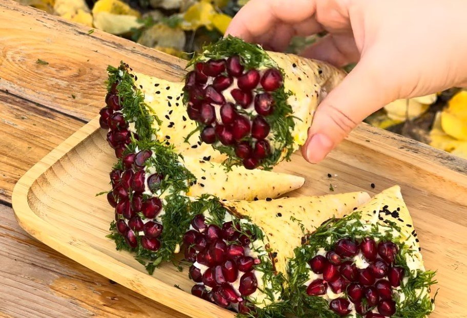- Наповніть запечені конуси начинкою і прикрасьте зернами граната і кропом.
