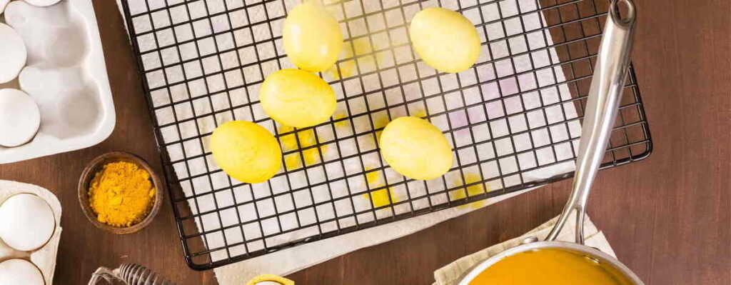 Яйця фарбовані куркумою мають дуже симпатичний золотисто-жовтий колір. Для більш рівномірного відтінку рекомендують використовувати оцет і витримувати в барвнику не менше 4 годин.