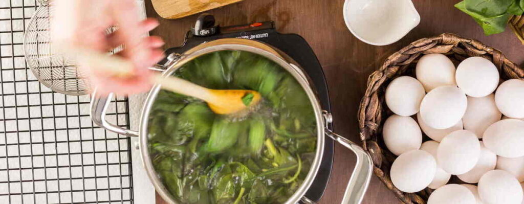 Бачили, як за допомогою соку шпинату роблять млинці зеленого кольору? Такий фокус можна зробити і з крашанками. Залийте жмут шпинату літром води, доведіть до кипіння і варіть ще 4-5 хвилин. Зніміть з вогню, дайте рідині трохи охолонути, покладіть до неї свіжозварені круто яйця і залиште на 6 годин. Крашанки виходять ніжно-зеленого, трохи м’ятного відтінку і дуже незвично виглядають у великодньому кошику.