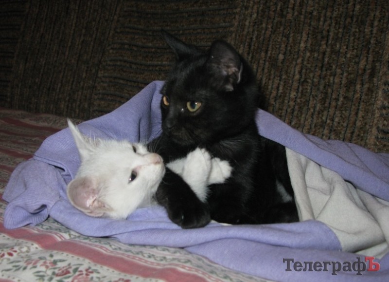 «Четырех маленьких котят люди выбросили умирать в котлован на строительной площадке. Они были такими дикими, что поймать их не было возможности. Мы оставляли им еду, но к людям они не подходили. На этой же площадке живет бездомный. Он и начал, как только мог, приручать котят - общая беда объединила человека и животных. Котята выжили, подросли, немного окрепли, стали ручными - и люди начали их потихоньку разбирать. В конце лета остался единственный черный котик. Осенние дожди заставили нас дать ему временное убежище, чтобы помочь найти новых хозяев. И когда мы пришли за ним, то увидели еще одного, совсем крохотного «бездомного» непонятного цвета. Старший котик (в отличие от людей, которые жестоко предали его в самом начале жизни) приютил маленького, согрел и спас от непогоды и голода. Домой они переехали вдвоем.