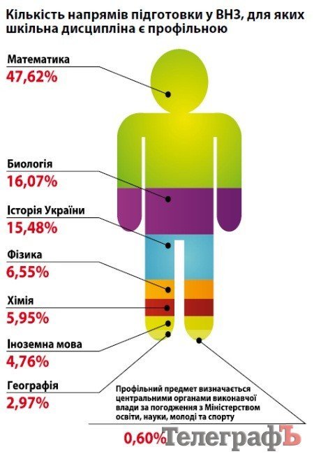 «Телеграф» передбачив реакцію частини батьків, які впевнені, що «моїй дитині математика не знадобиться, і нічого її мучити!». На базі державного Переліку конкурсних предметів та творчих конкурсів при вступі на основі повної загальної середньої освіти до вищих навчальних закладів для навчання за освітньо-кваліфікаційним рівнем бакалавра (Додаток 1) ми друкуємо для вас картинку, яка наочно демонструє, що для 47,62% напрямів навчання математика є профільним конкурсним предметом. Загалом в Україні можна навчатися у ВНЗ за 168 напрямами підготовки. Уявіть собі, для 80-ти з них математика – профільний конкурсний предмет при вступі.