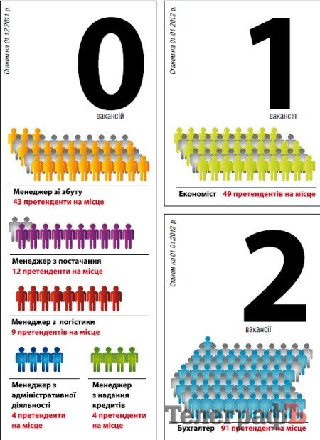 Життєві стереотипи спрощують процес прийняття складних рішень. Тому люди, які не бажають «заморачиваться», визначаючись із майбутньою професією для дитини, приймають стереотипне рішення: «Вона дівчинка, нехай вчиться на бухгалтера – для них завжди є робота!» або «нехай вже йде на економіста чи менеджера – он їх стільки і всі ж десь працюють!». Небезпека стереотипів у тому, що вони підказують найпростіше, та далеко не найвдаліше рішення. В умовах нестабільної української дійсності вони можуть здорово підвести – бо формальні рішення часто не відповідають конкретному моменту і конкретній людині. Щоб продемонструвати підступність стереотипів, «Телеграф» отримав у кременчуцькому міськрайонному Центрі зайнятості статистичні дані щодо вакансій на популярні спеціальності.