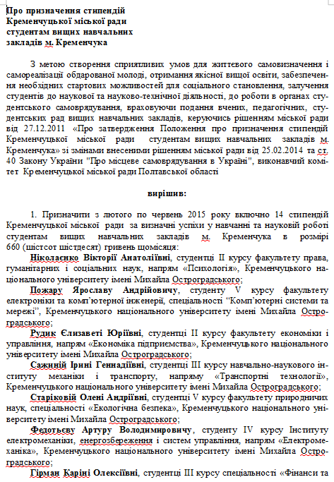 У Кременчуці 30 кращих студентів отримуватимуть стипендію міської ради у І півріччі 2015 року за видатні успіхи у навчанні та науковій роботі, а також за активну участь у громадському житті навчального закладу та міста. Про це повідомив віце-мер Віталій Малецький на зустрічі зі студентами-стипендіатами 11 лютого.