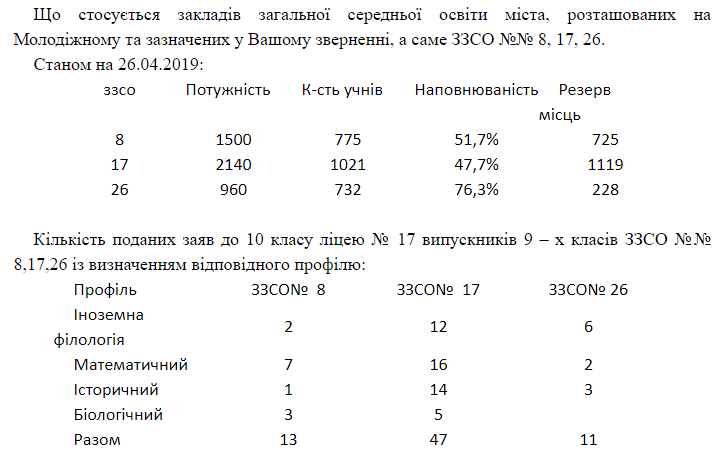 У петиції вимагали, щоб старші класи залишили також у школах №8 та №26. У відповіді пояснили, чому цього зробити не можуть. Серед іншого у відповіді навели дані щодо потужності, кількості учнів, наповнюваності та резерву місць у школах №8, №17 та №26. Станом на 26 квітня найбільший резерв місць є у школі №17, – 1 119 місць. У той час як у школах №8 та №26 – 725 та 228 місць відповідно. Також з відповіді стало зрозуміло, що у школу №17 найбільше подало заяв до 10 класу.