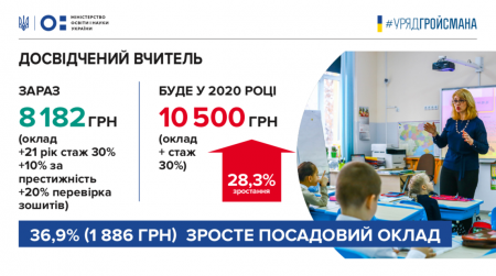 Заробітна плата досвідчених вчителів, які отримують надбавку за вислугу років 30%, також зросте. Зараз, отримуючи оклад, 30% надбавки за стаж, 10% за престижність та 20% за перевірку зошитів, щомісяця такий вчитель отримує 8 182 грн.
