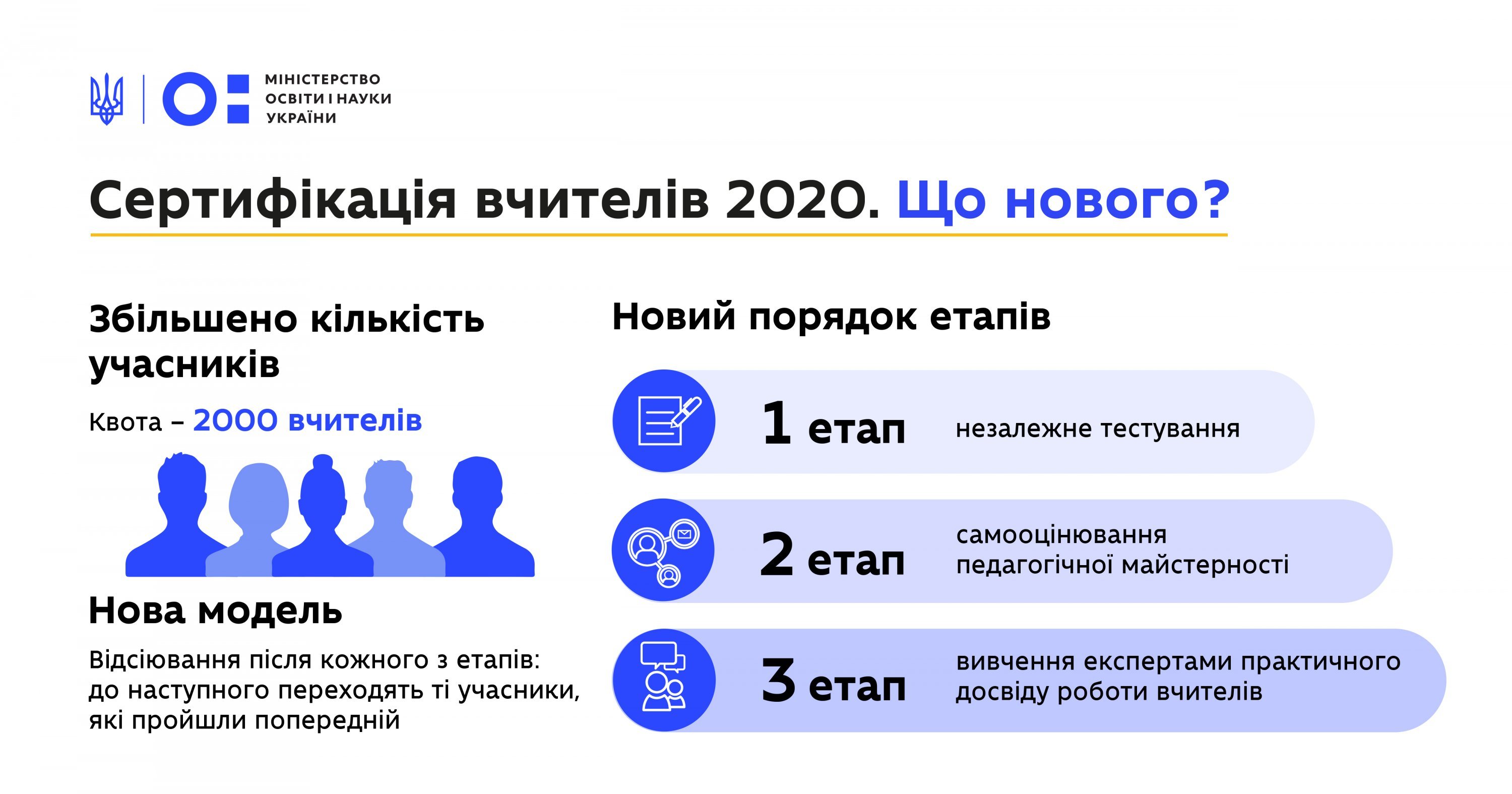 По-друге, сертифікація-2020 відбуватимуться за новим порядком. Першим етапом буде незалежне тестування – «ЗНО для вчителів». Другим – самооцінювання учасниками сертифікації власної педагогічної майстерності. Третім етапом стане вивчення експертами практичного досвіду роботи учасників.