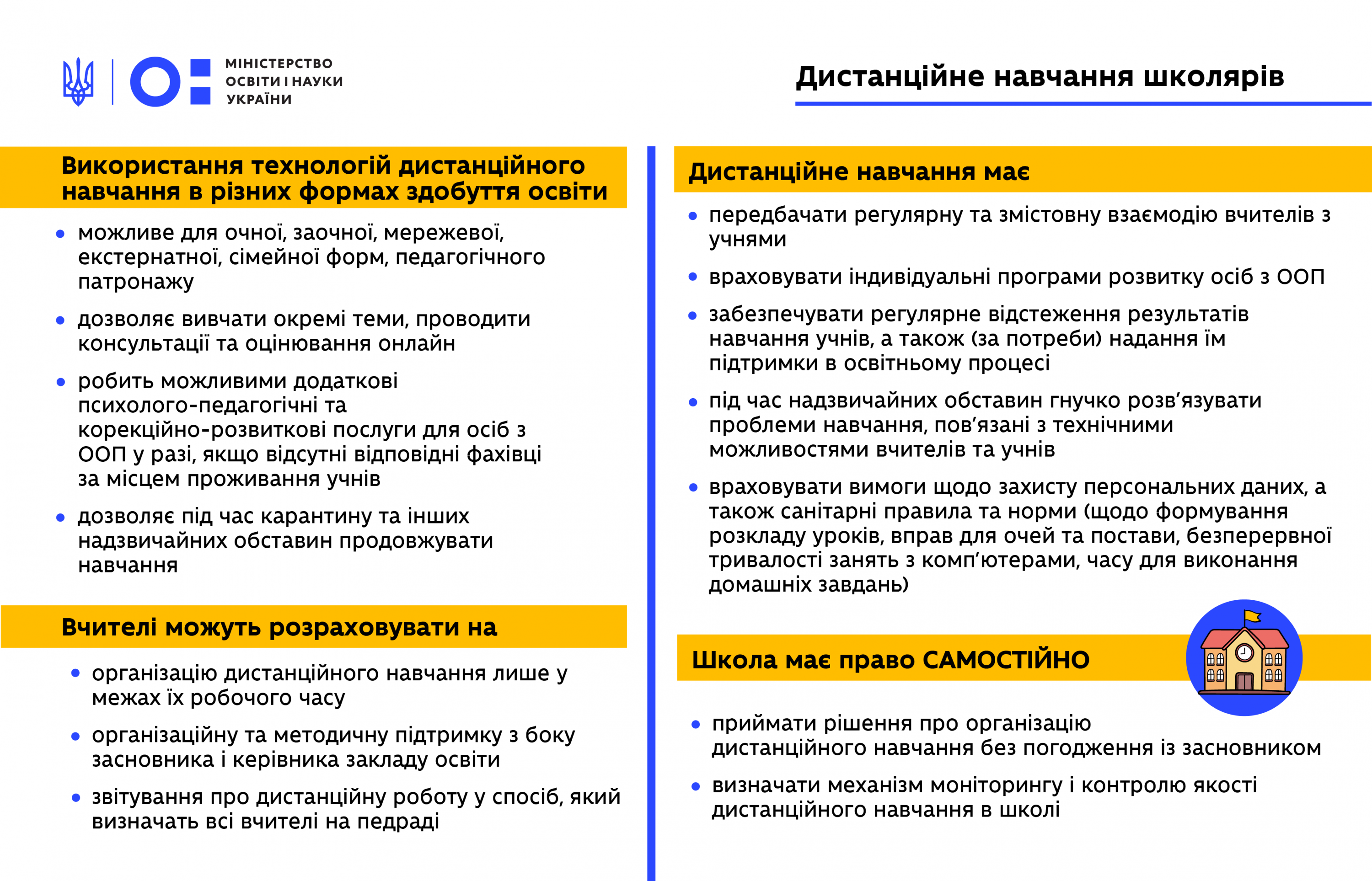 Документ також регулює можливість організації змішаного навчання: заклад освіти може визначити такий режим роботи, за якого учні почергово відвідують очні заняття, решту часу навчаючись дистанційно.