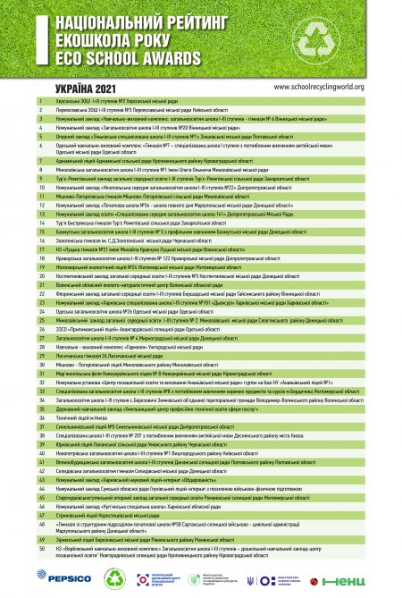 Два навчальні заклади Полтавщини названі кращими екошколами року. Вони змагалися за лідерство зі школами 24 регіонів України та потрапили до національного рейтингу з 50 кращих шкіл країни. Про це повідомили у пресцентрі Міжнародного молодіжного руху School Recycling World.