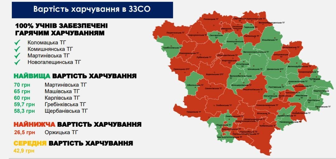Найбільше за обіди платять у Мартинівській громаді Полтавського району — 70 гривень. Найменша вартість харчування — у закладі освіти Оржицької громади — 26,50 гривень.