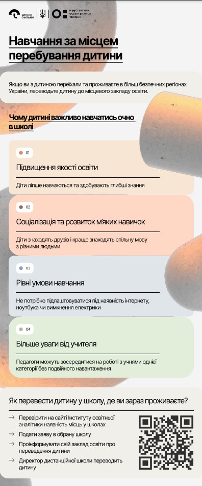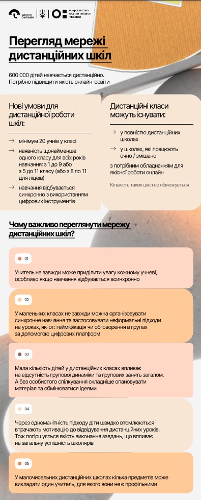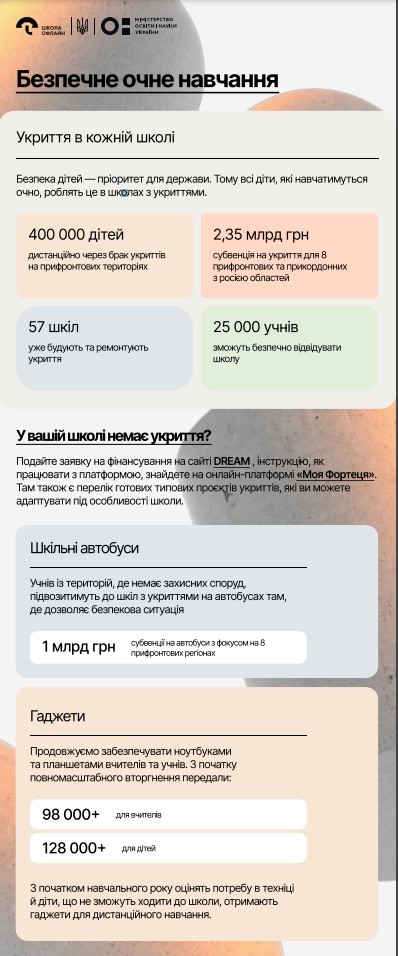 Зараз майже 1 млн дітей навчається онлайн: приблизно 600 тисяч в Україні, ще майже 400 тисяч за кордоном. Дистанційна освіта не дає змоги дітям соціалізуватися й розвивати м’які навички, пише пресслужба МОН. Під час знеструмлень учні не можуть навчатися або ж зовсім не мають потрібних для уроків гаджетів. Також неможливо проконтролювати, щоб усі діти, які навчаються онлайн удома, спускалися в укриття під час повітряних тривог.