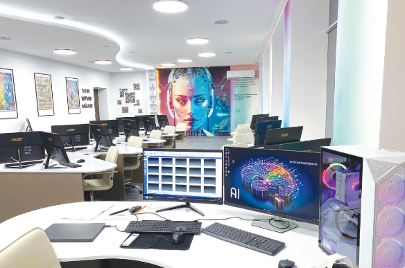 Інша ілюструє значення штучного інтелекту в освіті. Поряд із ними картини, які зображують майбутнє технологій у баченні ШІ та місто, наповнене технологічними інноваціями. На протилежній торцевій стіні встановлено багатофункціональний монітор — мультимедійну дошку з діагоналлю 85 дюймів. На великий екран виводиться зображення з комп’ютерів викладача та учнів. Користувач працює з ними безпосередньо на дошці через керування дотиком, як на смартфоні або планшеті. Також доступне голосове управління. Мультимедійний екран інтегровано до мережі, що об’єднує встановлені в кабінеті комп’ютери. Викладач бачить на своєму моніторі роботу, яку виконують учні на своїх місцях і, таким чином, має змогу контролювати виконання завдань та вносити коментарі.