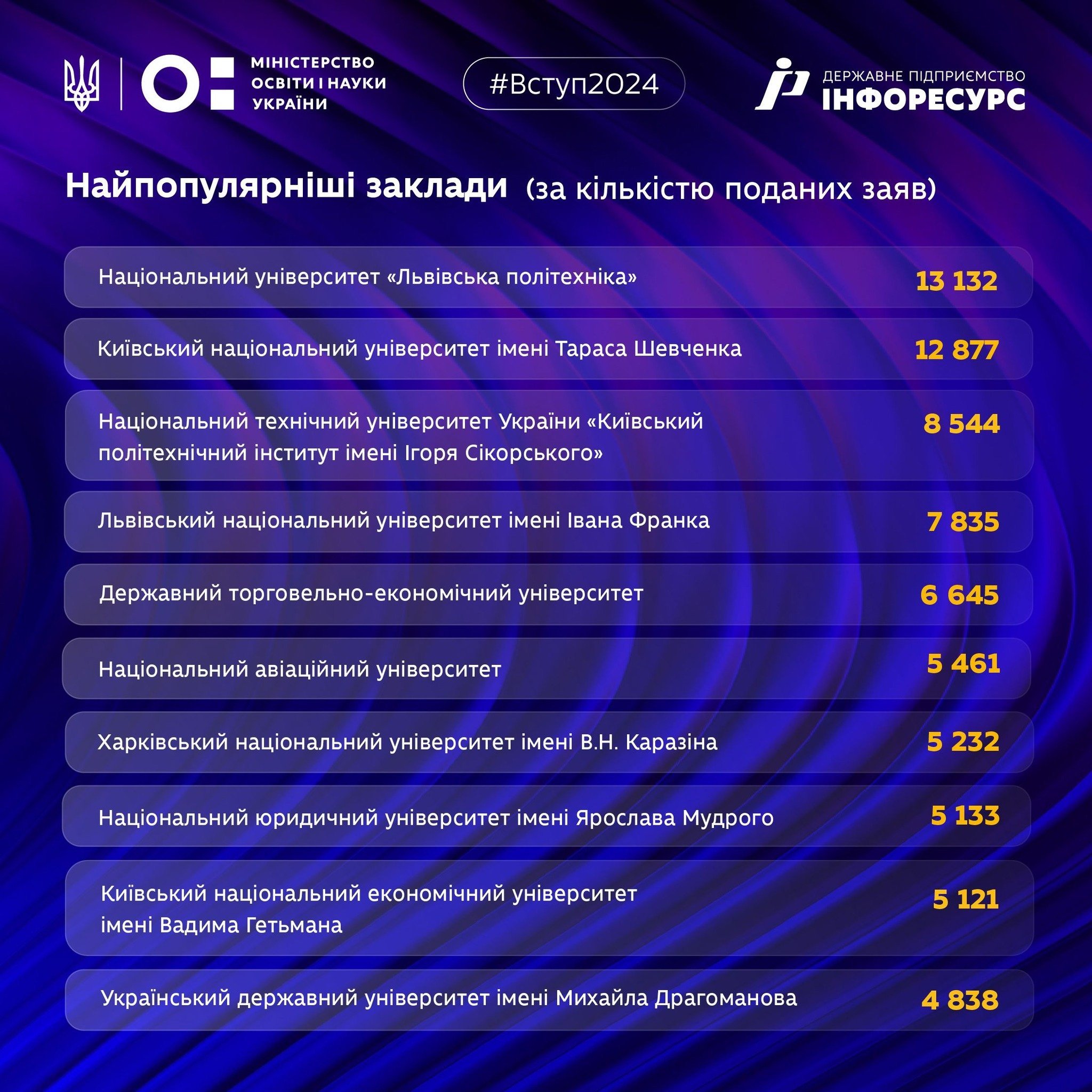 Найпопулярнішими закладами за кількістю поданих заяв стали Національний університет «Львівська політехніка» та Київський національний університет імені Тараса Шевченка.