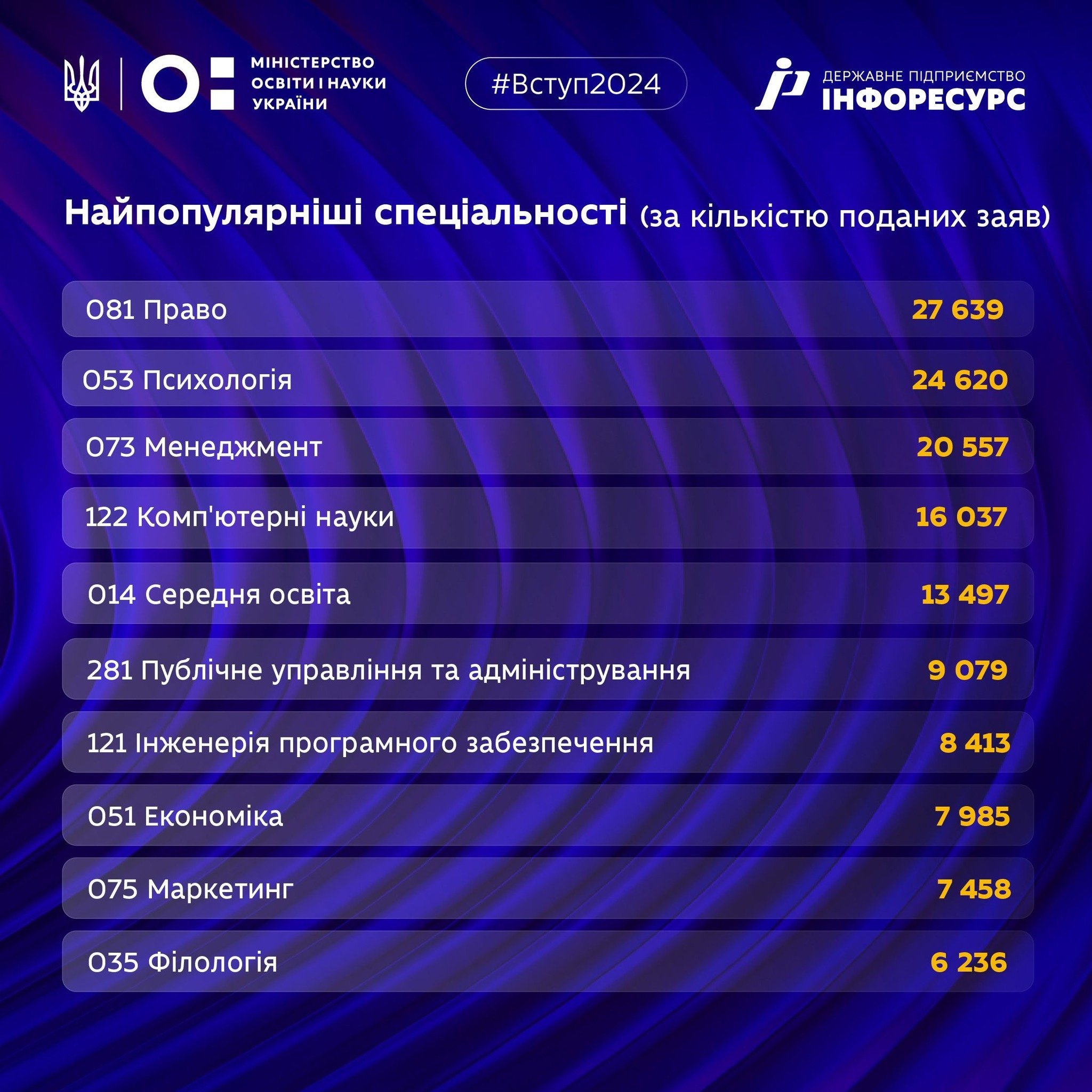 «Право», «Психологія» та «Менеджмент» залишаються найпопулярнішими спеціальностями за кількістю поданих заяв на вступ до магістратури у 2024 році. Про це повідомило на своїй Facebook-сторінці Державне підприємство «Інфоресурс».