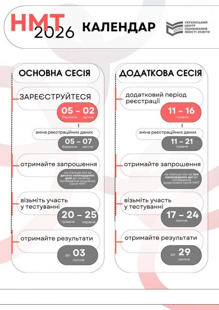 Основна сесія НМТ проходитиме з 20 травня до 25 червня, додаткова — з 17 до 24 липня.