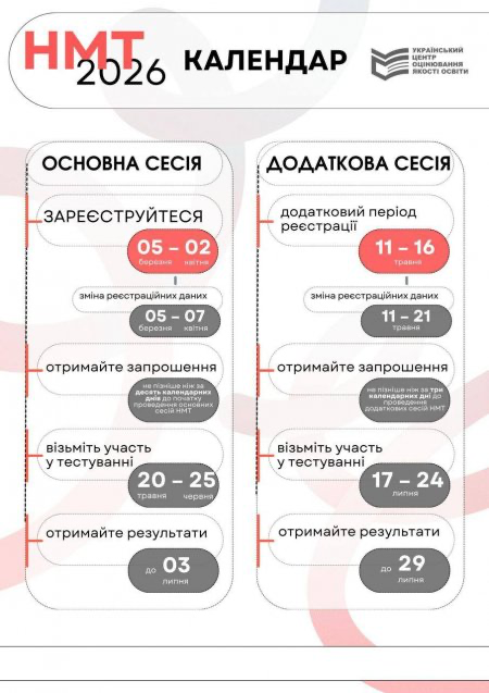 Наказом Міністерства освіти і науки України затвердженоКалендарний план організації та проведення у 2026 році національного мультипредметного тесту (НМТ). Про це повідомилина сайті Українського центру оцінювання якості освіти.