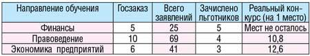 По данным приемной комиссии КГПУ, в 2008 году в университет на дневную форму обучения зачислено 611 студентов, из них 39 – льготники. Если брать простое соотношение, то это вроде бы не много. Но все дело в том, что абитуриенты-льготники, имеющие право на зачисление вне конкурса, как раз идут на престижные специальности, госзаказ на которые, к тому же, невелик. Так, на направлении обучения «Финансы» все пять бюджетных мест заняты «внеочередниками». Похожие ситуации и с направлениями «Правоведение» и «Экономика предприятий» (данные в таблице).