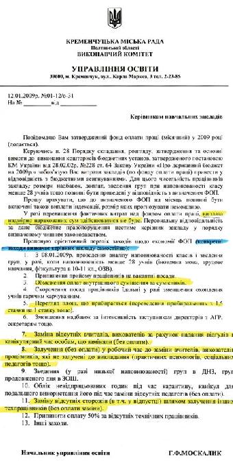 Коли б мова йшла про окрему школу, можна було б припустити, що це ініціатива дирекції. Але ж для того, щоб група директорів діяла в одному напрямку, має існувати певне розпорядження міського управління освіти. «Телеграф» знайшов цей документ. Він досить важливий, щоб ви його побачили у повному обсязі, а не прочитали редакційний переказ. Тож лист № 01-12/о-31 начальника управління освіти пана Москалика перед вами. У ньому пан Москалик пропонує директорам орієнтовний перелік заходів щодо економії фонду заробітної плати. Та зауважує, що конкретні заходи керівник закладу визначає самостійно. Треба розуміти, він же самостійно відповідає у разі виникнення трудових суперечок.