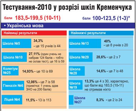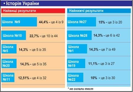 Чверть учнів спеціалізованої школи №10 з поглибленим вивченням англійської мови показала високий рівень знань з історії України. Проте один учень цієї школи таки склав тест на низький бал (до 123, що відповідає від 1 до 3 за 12-бальною шкалою). З історії України школа №10 «відірвалася» від інших. Виняток – школа №9. Але, як ми вже зазначали, там взагалі в цьому році було небагато випускників. Тож важко порівнювати їхній результат.