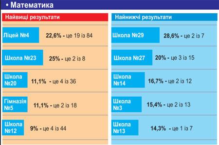 Майже чверть учнів ліцею №4, які складали тести з математики, отримали високі бали. Низького рівня знань математики не виявив жоден з тих, хто взяв участь у тестуванні. Інші школи, де теж знайшлися вундеркінди-математики, йдуть із великим відривом від профільного ліцею. (За винятком школи №23, але там математику складало всього 8 учнів).