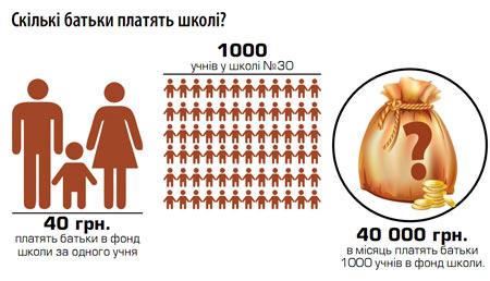 – Ми ходимо до 30-ї школи. Платимо щомісяця по 40 гривень на школу, на зошити здали по 60 гривень, по 70 гривень батьківський комітет зібрав на подарунки вчителям, минулого року збирали по 240 гривень на нові меблі. Платимо на щось весь час, квитанції не дають.