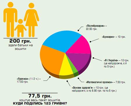 Мама одного з першокласників 5-ї гімназії розповіла «Телеграфу», що на початку року вчителька запропонувала батькам здати по 200 гривень на обов’язкові за програмою зошити – «прописи» (1 і 2 ч.), «математика», «Я і Україна», «основи здоров’я», «букварик» та «післябукварик». Слухняна мама гроші здала. Квитанцію їй не дали, натомість сказали, що кожен зошит коштує 20 гривень. Мама, яка звернулася до редакції, дуже здивувалася – бо ходила по книжкових магазинах і побачила, що ціни на зошити значно нижчі. Обурення – чому ж із неї здерли так дорого – муляє жінку досі. Адже статки вона має невеликі.