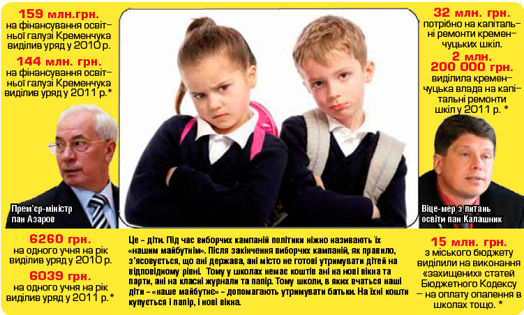 У попередньому номері «Телеграф» надрукував матеріал «Не хочу, щоб помстилися дитині – тому і сплачую гроші…» Публікація стосувалася безкінечних грошових поборів у кременчуцьких школах – у даному випадку мова йшла про школи № 5 та №30. Ми навели скарги батьків та коментарі директорів шкіл з цього приводу. Батьки скаржились на те, що весь час за щось платять, що суму виплат їм встановлюють – тобто про добровільність так званого благодійного внеску мова не йде. Також батьків обурювало, що вони не можуть дізнатися, на що достеменно витрачені отримані від них кошти. Директори шкіл, зі свого боку, стверджували, що збирання коштів у їхніх навчальних закладах ведеться абсолютно добровільно, і вони – як директори – не мають до процедури жодного відношення, бо збиранням коштів займаються батьківські комітети та шкільний благодійний фонд.