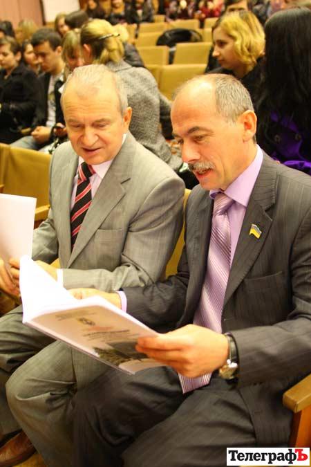 Віце-мер з гуманітарних питань пан Хоменко (справа) отримав у подарунок товстелезний збірник наукових робіт учасників ІІІ Всеукраїнської конференції молодих вчених. Збірник вийшов такий важкий, бо складається з 501-ї наукової доповіді!