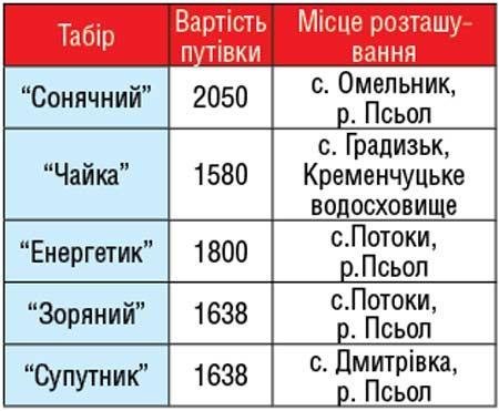 Поблизу Кременчука є п’ять дитячих таборів, розташованих біля води, куди батьки зазвичай відправляють своїх дітлахів на відпочинок. Цей кризовий рік не виняток – у відділі у справах освіти, сім’ї та молоді кажуть, що вже 31 травня перша група дітей відправиться до табору «Сонячний». Щоправда, тим, хто хоче оздоровити свою дитину цього літа, доведеться викласти за путівку відсотків на 20 більше, ніж минулого року, а це гривень 300-400.