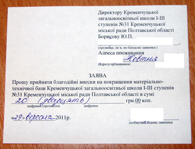 На підтвердження своїх слів відвідувач показав друковану заяву зі стандартним текстом: «Прошу прийняти благодійні внески на покращення матеріально-технічної бази Кременчуцької загальноосвітньої школи I-III ступенів №31». Далі – сума внеску, число, особистий підпис платника. Чоловік розповів, що класний керівник передала зразок заяви через дитину і нагадала, що треба здати батьківські внески і підписати заяву. Батьки підписали заяву і передали через дочку щомісячні 20 гривень. Дитина віднесла все це до школи. Чек їй не дали.