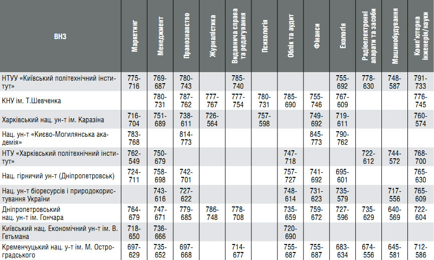 Аналізуючи бали та вступ абітурієнтів-2012, ми взяли першу десятку найкращих вишів України відповідно до рейтингу вищих навчальних закладів «Топ-200 Україна» – 2011/2012 рік» (див. на сайті www.euroosvita.net). Звісно, не оминули найближчий державний ВНЗ – Кременчуцький національний університет імені Михайла Остроградського (55-те місце в рейтингу, що теж престижно). Дізнатися про бали, необхідні для вступу (із досвіду вступної кампанії-2012), можна на сайті інформаційної системи «Конкурс» www.vstup.infо, де зведена інформація про всі ВНЗ. Для порівняння взяли популярні серед абітурієнтів спеціальності (гуманітарні, економічні, з природничого напрямку – екологію) та менш популярні – інженерні.