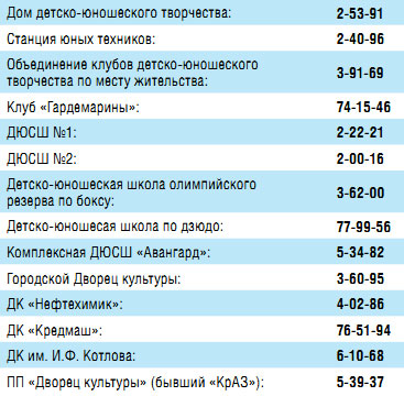 В музыкальных школах можно заниматься вокалом. В ДДЮТ есть две студии, в одну принимают даже ребят детсадовского возраста. И очень много различных вокальных студий и ансамблей при Дворцах культуры. Например, в ДК «Нефтехимик» мы нашли детский хор. В «Кредмаше» есть шоу–группы, где учат и петь, и танцевать. Ребят принимают разных возрастных категорий: как самых маленьких, 4-6 лет, так и тех, что постарше – 14-15 лет. И очень много различных кружков и студий в ГДК.