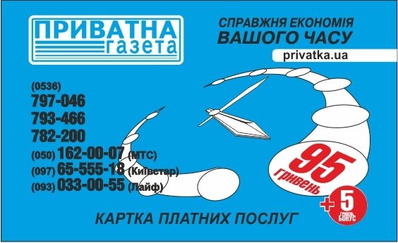 Карточка платных услуг «Приватна газета» – этот полезный подарок точно оценит человек, занимающийся бизнесом. Используя карту платных услуг, можно продать или купить товар, найти сотрудника, привлечь партнёра, сообщить о выгодных предложениях. И сделать это очень просто! С помощью карты платных услуг «Приватна газета», не выходя из офиса или дома, можно разместить любое объявление в еженедельнике «Приватна газета» и сайте www.privatka.ua. Позвонив по указанному на карте телефонному номеру, приветливый оператор примет объявление клиента и ответит на любые дополнительные вопросы.