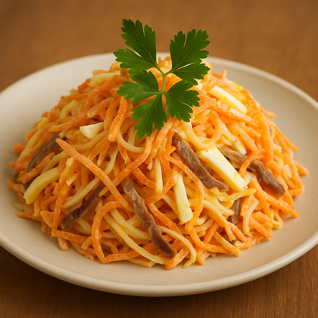- М’ясо нарізати тоненькою соломкою, добре засмажити, щоб було аж хрумке, додати до решти інгредієнтів.