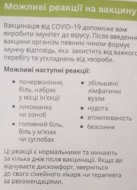Виробник вакцини попереджає, що такі реакції можливі та нормальні, про це йдеться і в пам'ятці, яку видають у пунктах щеплення від COVID-19.