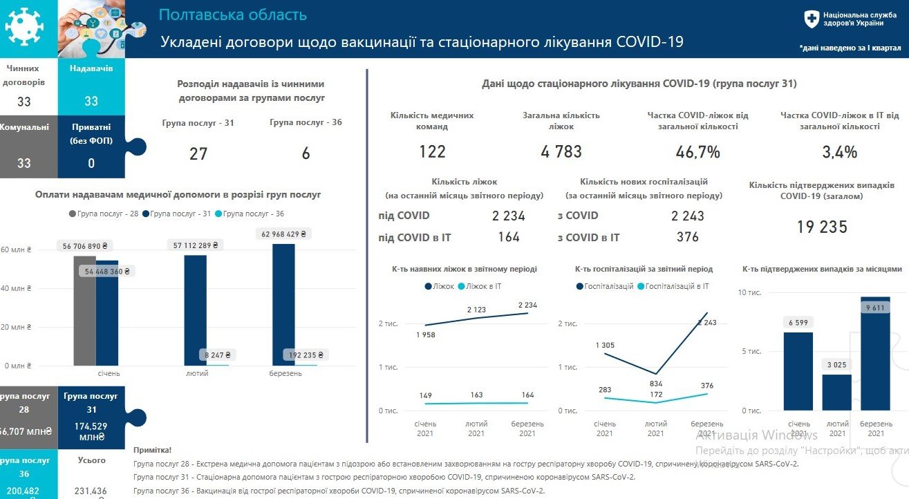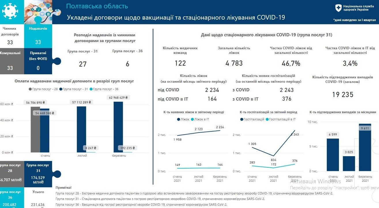 За даними НСЗУ, на Полтавщині зареєстровані 34 медичні заклади, які надають допомогу пацієнтам з коронавірусом. Кошти виділялись на екстрену медичну допомогу (56,707 млн. грн), стаціонарну допомогу (174,529 млн. грн) та вакцинацію від COVID-19 (200,482 тис. грн).