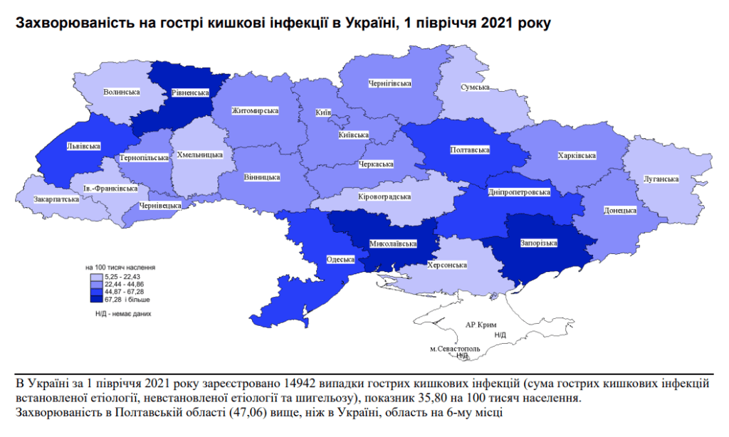 За 7 місяців від початку цього року серед мешканців Полтавської області зареєстрували 881 випадок гострих кишкових інфекцій, з них 572 – у дітей віком до 17 років. Найбільше – у Полтаві (306, з них у дітей – 195), Кременчуці (148, у дітей – 138), Горішніх Плавнях (51 і 25 відповідно).