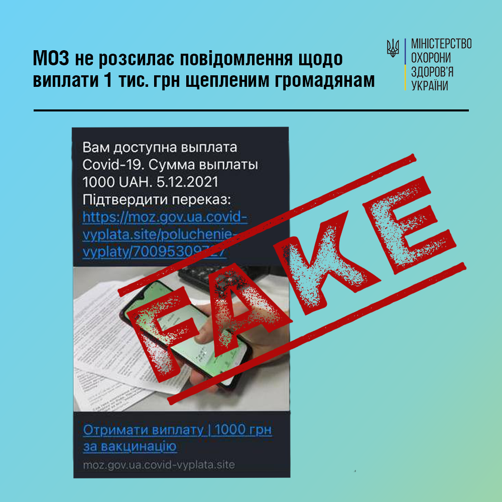 У мережі поширюються неправдиві повідомлення нібито від імені Міністерства охорони здоров’я, в яких пропонують користувачам надати контактні дані для виплати 1 тис грн людям, які завершили повний курс щеплення від COVID-19.