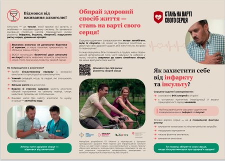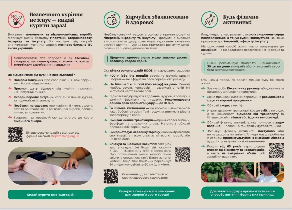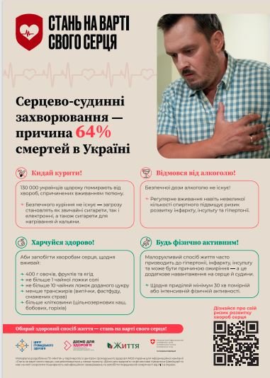 Матеріали розроблено за сприяння ГО «Життя», яка реалізує інформаційну кампанію «Стань на варті свого серця» у партнерстві з Центром громадського здоровʼя МОЗ України у рамках проєкту «Діємо для здоров’я» за фінансової підтримки Швейцарії та має на меті скорочення поширеності неінфекційних захворювань в Україні та запобігання передчасній смертності від НІЗ в Україні