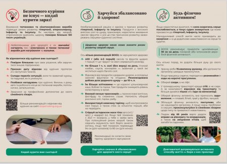 - відмовитися від куріння та електронних пристроїв для куріння, адже це спричиняє розвиток інфаркту, інсульту й хвороби периферичних судин. Безпечного куріння не існує. Пам’ятай: щороку 130 000 українців помирають від хвороб, спричинених вживанням тютюну.