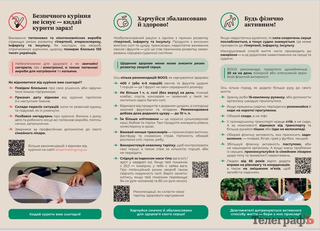 Матеріали розроблено за сприяння ГО «Життя», яка реалізує інформаційну кампанію «Стань на варті свого серця» у партнерстві з Центром громадського здоров?я МОЗ України у рамках проєкту «Діємо для здоров’я» за фінансової підтримки Швейцарії та має на меті скорочення поширеності неінфекційних захворювань в Україні та запобігання передчасній смертності від НІЗ в Україні