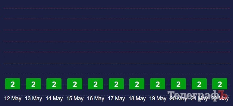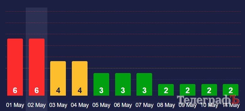 - 1, 2 травня — K-індекс 6 (висока магнітна буря)