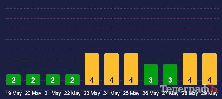 - 23 — 25 травня — K-індекс 4 (середня магнітна буря)