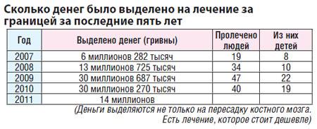 Программа «Лечение больных за рубежом» действует уже пятнадцать лет. Она призвана оплачивать лечение в других странах людей, которым не могут помочь в Украине. В прошлом году из бюджета на нее потратили 30 миллионов гривен. На трансплантацию костного мозга отправляют в первую очередь в Беларусь, Италию, Германию и Россию.